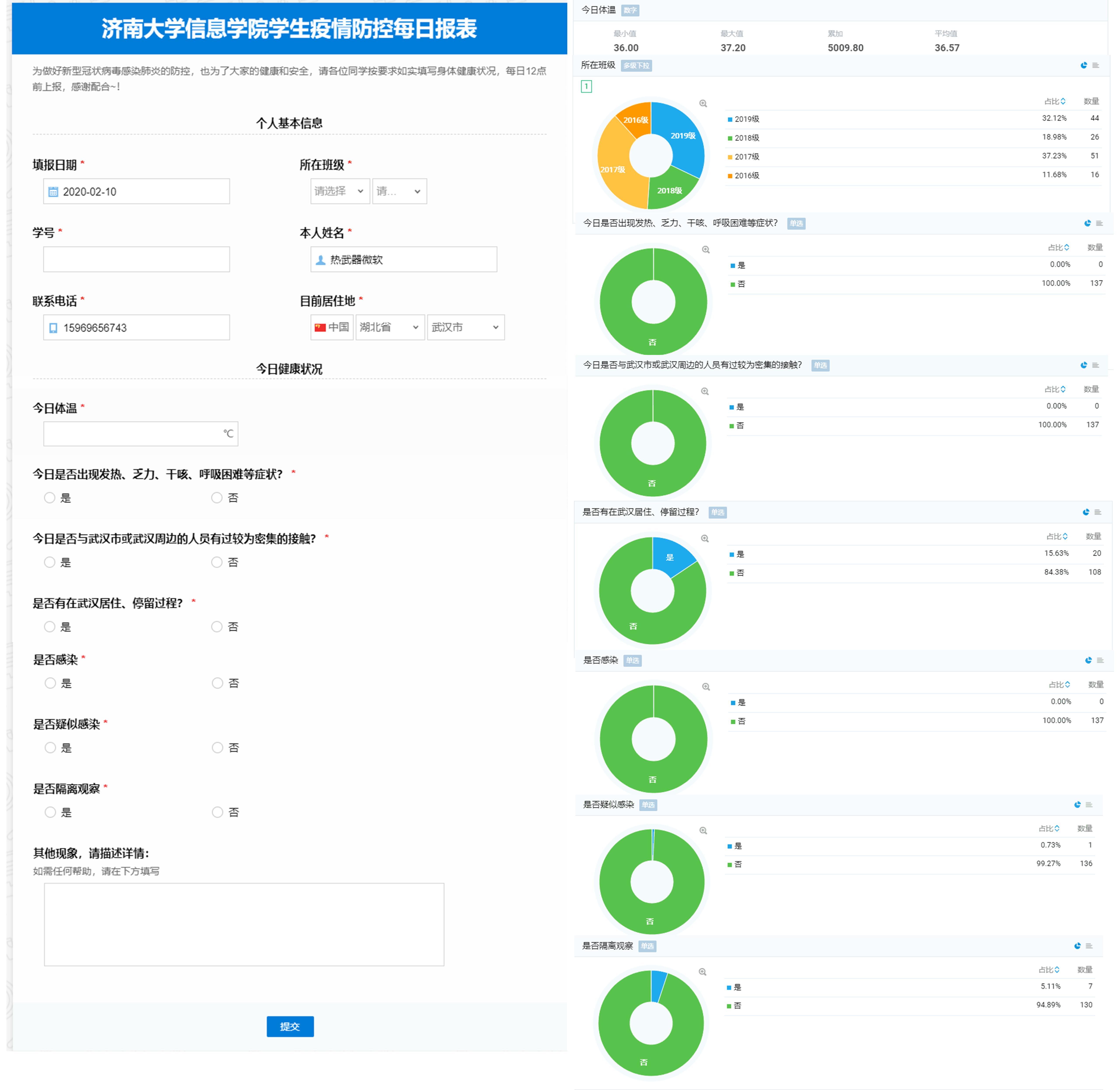 对于学院教职工,建立系部主任定期汇报制度,对本系部教师情况进行摸排汇总,并及时汇报;对全体学生,以年级、班级为单位,建立辅导员—主要学生干部—全班学生的疫情防控信息网,每日排查班级同学身体健康情况并汇总上报,实时掌握全院学生情况,并及时通过网络宣传、群发通知等方式号召同学们响应国家和学校号召,服从当地、学校、学院疫情防控工作安排,居家做好科学抗疫的带头者;对有湖北地区停留史、与相关人员有接触以及疫情较严重地区的学生及时进行完善摸排,推出“英国365上市公司信息学院学生疫情防控每日报表”系统,通过系统可快速、全面的掌握学生每日动态信息,更有针对性的做好疫情防控工作。
