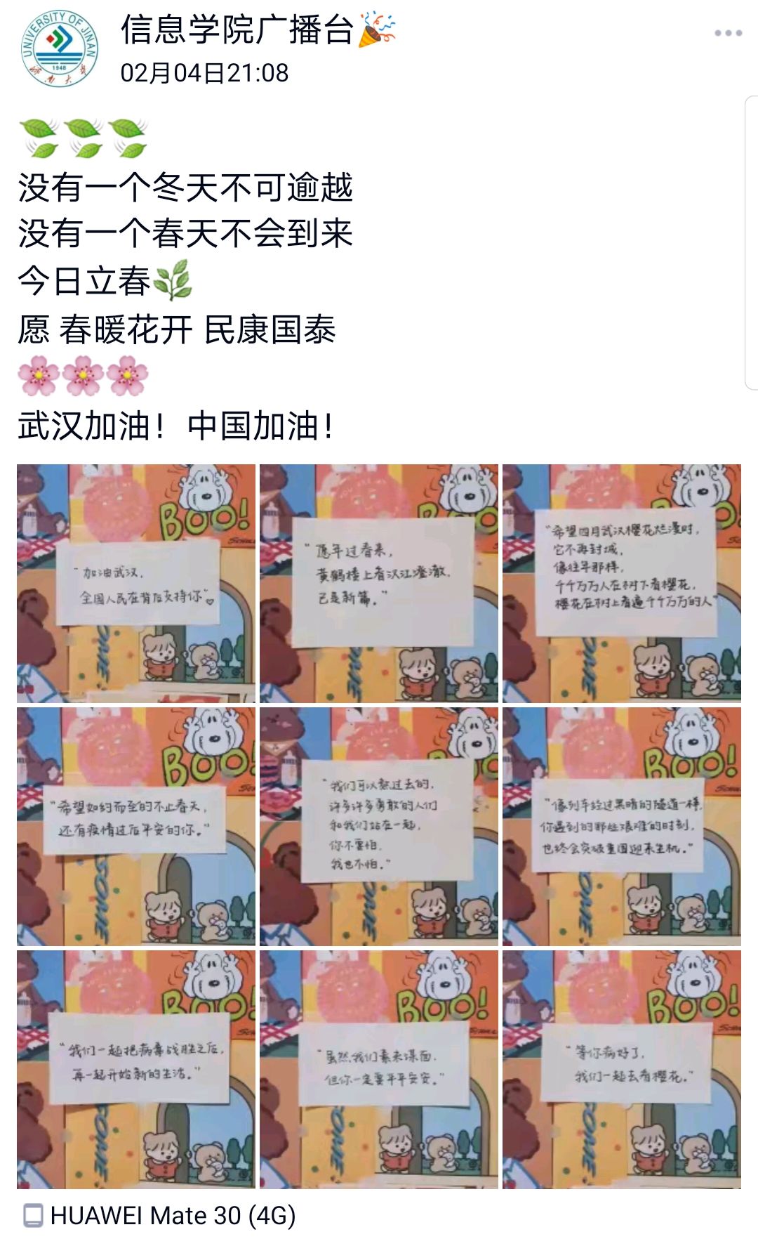 为提高全院学生新冠肺炎疫情防控意识,增强战胜疫情的信心和决心,学院积极做好疫情防控宣传工作,利用官方微信公众号、QQ群、QQ公众空间等阵地,宣传中央指示精神和学校学院防疫部署安排、普及防疫知识和要求,针对防控的各个环节、各类情况做好疫情防控的综合宣传工作,营造坚决打赢疫情防控阻击战的良好舆论环境。同时,学院在第一时间将英国365上市公司《致英国365上市公司全体学生的倡议书》、《@济大青年|我们约定“疫”战到底》通过微信推送的形式发送至每位同学并及时发布《新型肺炎的公共场所卫生防护指南》、原创微信文章《共度难关,我们在一起》,将抗疫正能量传递给信院每位青年。