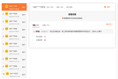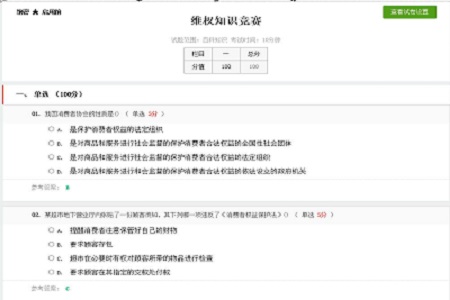 此次维权知识竞赛采取了线上答题的形式,为提高答题质量,手机端操作时切屏两次后,系统将判为作弊并自动交卷。每位同学注册好账号后,由系统随机从题库中抽取20道题目,答题时间为10分钟。题目涉及多方面,针对不同的身份,会有不同的题目,如毕业生的就业问题,就业后的工龄问题,不同类型的专利权的保护问题,食品健康类问题,消费时权益受到损害时的维权途径及有关法律法规等。待竞赛结束后,系统会给出正确答案和解析,并提供相关的学习资料供同学们参考。