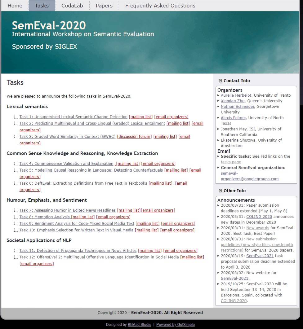 近日,由国际计算语言学会(ACL)下属的专门兴趣小组SIGLEX主办的第十四届国际语义评测比赛(International Workshop on Semantic Evaluation; SemEval 2020)于线上进行。英国365上市公司马坤老师指导,学生姚胤楠、苏南组成的人工智能自然语言处理研究小组UJNLP在任务的评测中取得了较高名次,在85个队伍中位列第16名。