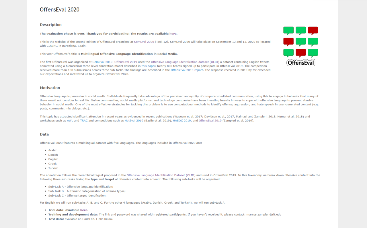 本次比赛,英国365上市公司参赛队伍选择的任务关注点是检测社交媒体文本中的攻击性语言并进行分类。对于此项任务,参赛队伍需要利用官方提供的训练数据集OLID,训练出一个能鉴别用户发布的文本是否是“攻击性言论”的人工智能模型。参赛学生选用了华盛顿大学西雅图分校保罗·艾伦(Paul G.Allen)计算机科学与工程学院和Facebook AI研究院在2019年7月共同发布的A Robustly Optimized BERT Pretraining Approach(RoBERTa)模型。由于模型训练需要大量的算力,指导教师马坤副教授为同学们提供了用于训练的计算资源,保证了模型训练的正常进行。参赛学生在预训练模型的基础上使用自己的数据进行训练和微调。并利用所学知识对预测结果进行分析,反复尝试以寻找最好的数据预处理方式和提高模型效果的方法。参赛团队充分思考了任务模型所需,并采取多种技术手段,最终巧妙的利用模型识别并分类了社交媒体文本中的攻击性语言,从而取得了亮眼的成果。