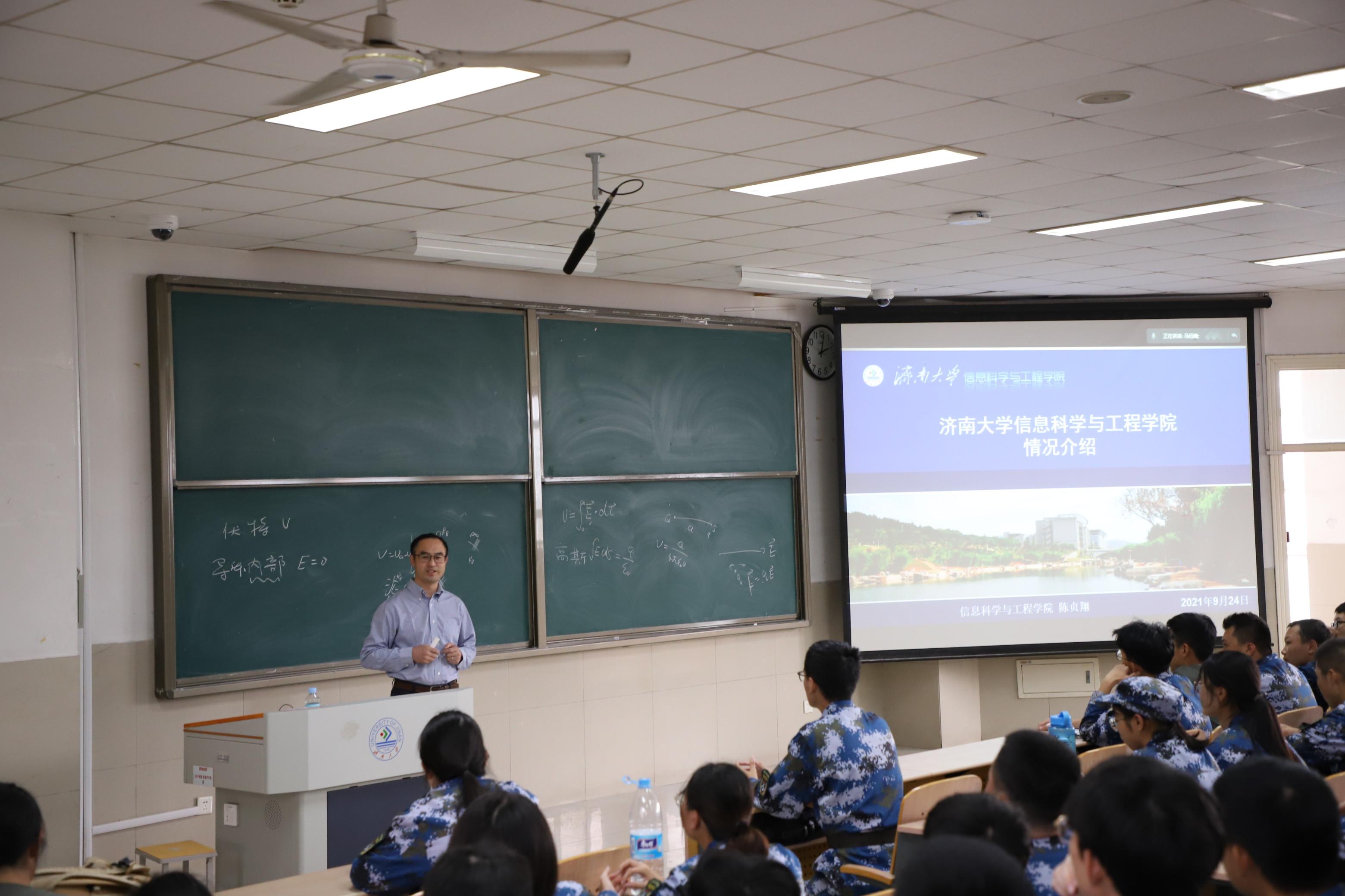 陈贞翔院长首先代表学院对2021级全体新生的到来表示欢迎。入学教育上,陈贞翔院长从学院概况、专业建设、科学研究、学科建设、国际交流合作、学生工作等方面进行了介绍。学院目前有七个本科专业,其中有三个专业获国家一流本科专业建设,计算机科学与技术专业和网络工程专业通过工程教育认证专业。学科建设方面,“计算机科学与技术”学科是“十四五”山东省“优势特色学科”学科,在全国第四轮学科评估中获B-评级,位列山东省属高校并列第一名。陈院长指出,学院自2001年建院以来,经过20年的发展,取得了一系列令人瞩目的成绩,学院目前正处于快速发展的阶段,2021级新生的到来更是为学院注入了新生力量,学院也努力为每一位青年学子搭建筑梦追梦的阶梯。