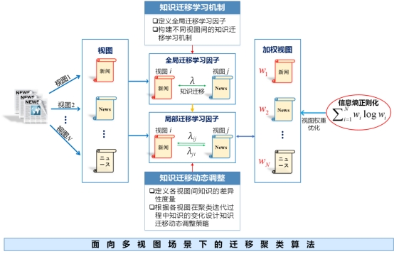 如图一和图二所示,成果聚焦分布式及多视图数据聚类场景下各网络节点及视图的信息融合问题,借鉴迁移学习理论思想,设计新型分布式及多视图迁移聚类算法。充分利用各节点、各视图的互补信息,构建节点及视图间的知识迁移学习机制,有效促进各节点及视图间的信息融合;定义合理的节点及视图间的差异性度量,准确地指导不同节点及视图间的知识迁移学习程度;根据聚类迭代过程中各节点及视图的知识变化,设计节点及视图间知识迁移的动态调整策略,提升聚类性能并确保稳定的聚类融合结果。相关研究引起西安电子科技大学、陕西师范大学、北京工业大学、上海科技大学、悉尼科技大学等高校的关注。