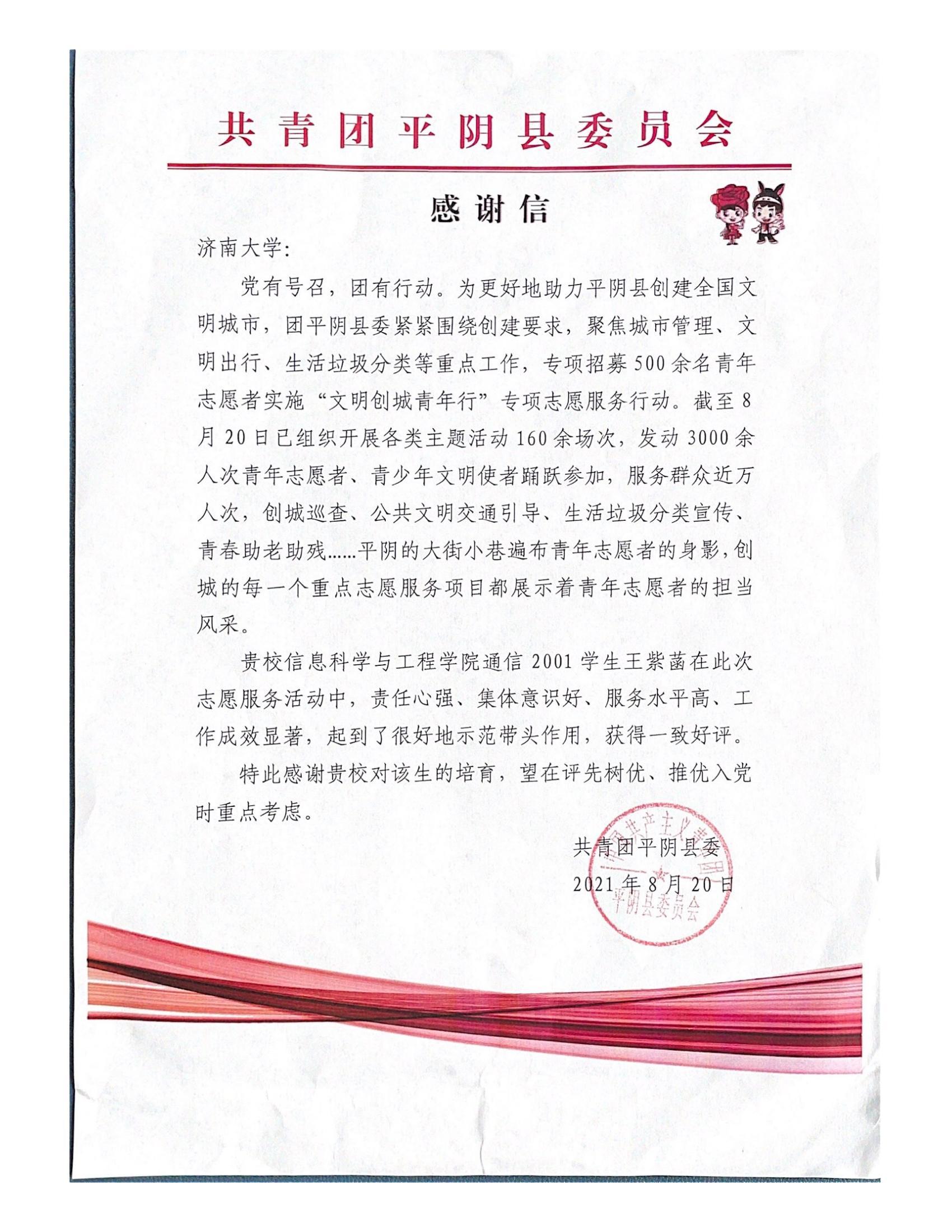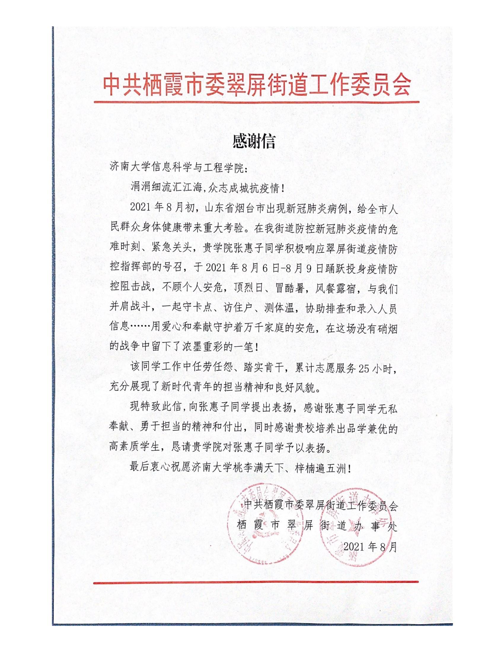近日,英国365上市公司收到来自共青团平阴县委员会和中共栖霞市翠屏街道工作委员会的感谢信,感谢英国365官网学生王紫菡和张惠子在志愿服务活动中的积极表现以及担当精神。