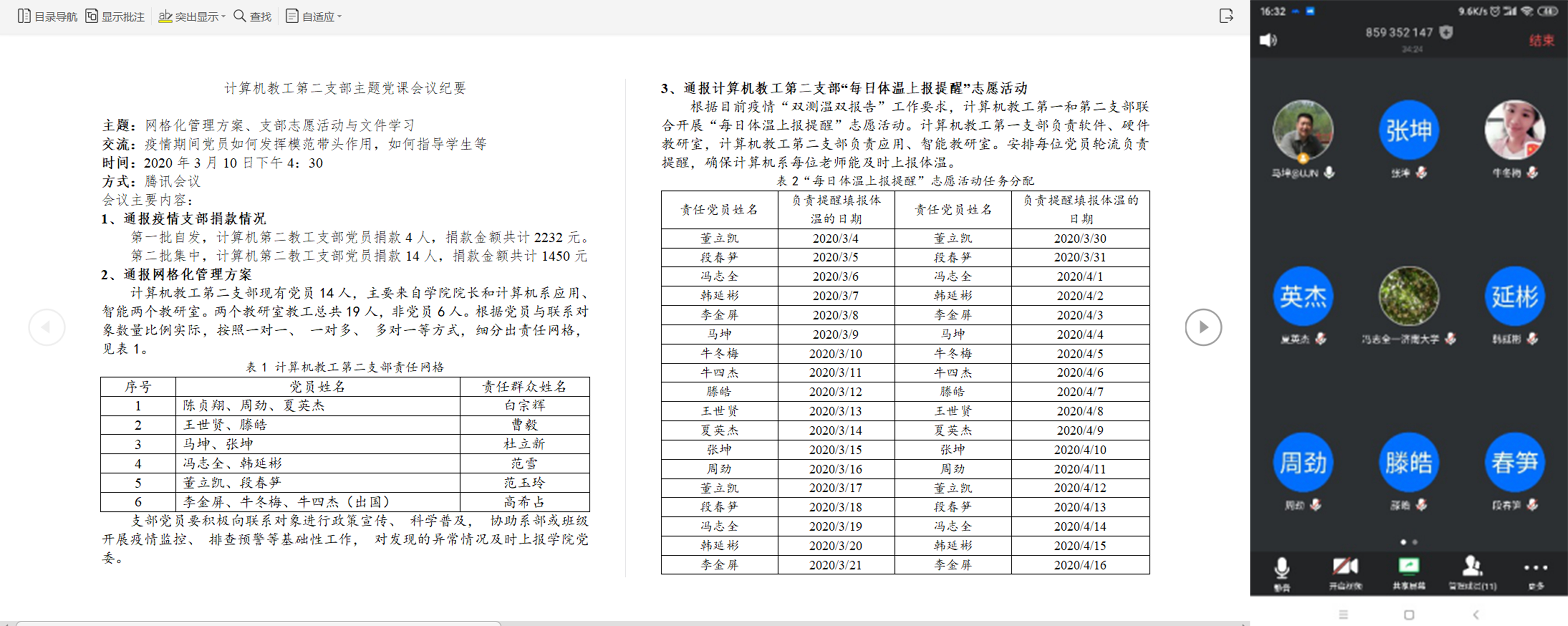 党课上,全体党员在“心系病患”的战疫先锋钟南山院士、“号令党员冲在前”的张文宏教授和“拼渐冻生命与疫魔竞速”的金银潭医院院长张定宇等人的鲜活故事中,深刻理解了中国共产党人的初心使命;在十天落成的火神山医院和大年三十驰援武汉的军人故事中,见证了“中国速度”与“强国力量”;在老党员匿名捐款、社区志愿者的细碎工作和便利店老板“温暖周边一公里”的情怀中,感受着众志成城的志愿爱国热情。学院要求大家不仅要“动以情”,更要“践以行”,要把向英雄们学习的思想落实在日常学习、工作和生活中。尤其是在当前疫情防控最吃劲阶段,大家更要以身作则,充分发挥师生党员干部在各项工作中的模范带头作用,配合学校和学院做好各项疫情防控工作和线上教学工作。