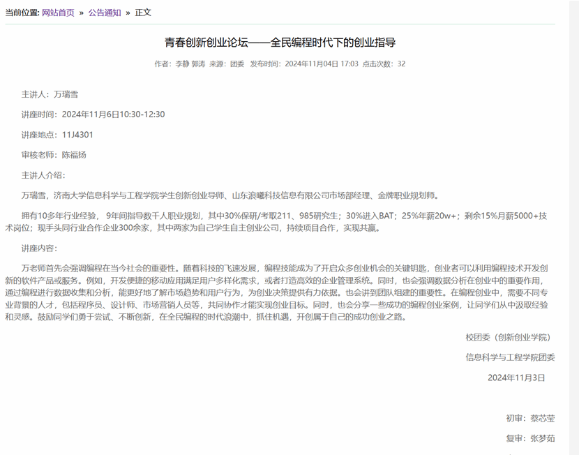 随着编程技术的普及和应用的不断拓展,英国365上市公司于2024年11月6日在11J4301举办了一场主题为“青春创新创业论坛——全民编程时代下的创业指导”的讲座。此次活动特别邀请了万瑞雪,一位在编程和创业领域具有深厚背景的专家,为学生们带来了一场充满洞见的分享会。