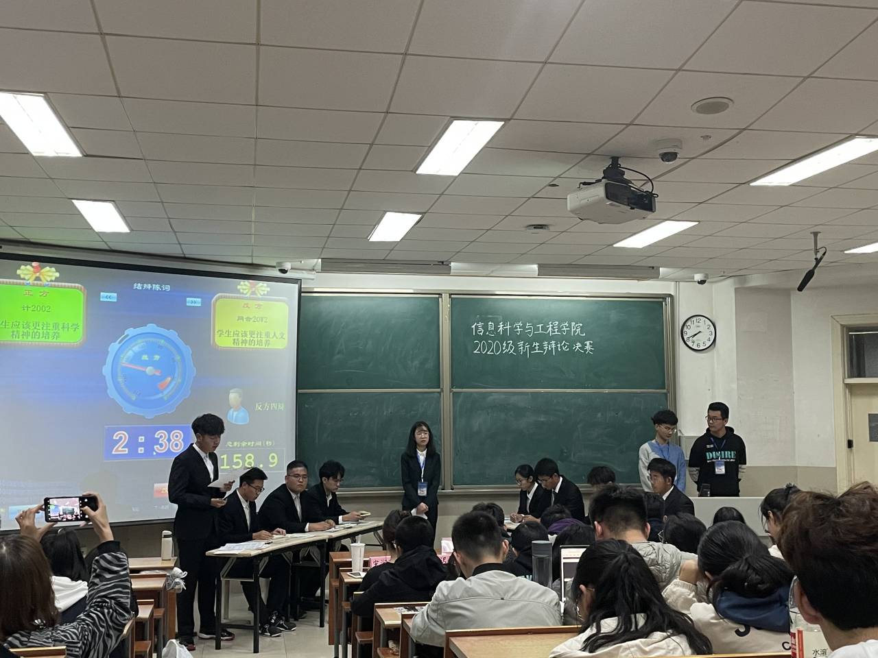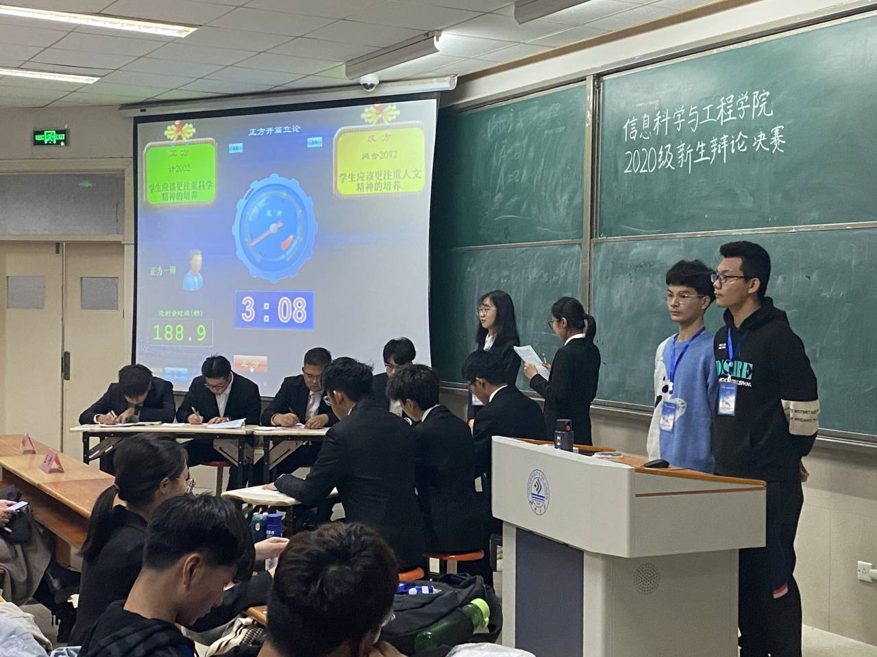 各参赛队伍由抽签决定辩论方,在主持人一声“开始”后,正反方一辩各做限时为三分三十秒的陈词。在开篇立论环节,正方以人文精神对学生的影响,简明严谨的阐述“学生更应该注重人文精神的培养”这一观点;反方则以科学精神的重要性为中心,陈述己方“学生更应注重科学精神的培养”这一观点。攻辩环节,双方选手据理力争,引经据典,口若悬河,始终围绕着“学生应该更注重人文精神的培养还是科学精神的培养”展开激烈辩论。经过激烈的角逐,网合20w2班赢得了上半场,反方二辩获得最佳辩手称号。下半场的辩题为“人脸识别技术实时监测学生表现是否可取”。经过立论陈词、攻辩阶段、攻辩小结、自由辩和总结陈词五个环环相扣的激战,整场比赛高潮迭起,精彩不断,观众也积极参与,和选手们互动,现场气氛十分活跃。最终计2005班取得了下半场比赛的胜利,正方一辩获得了下半场最佳辩手的称号。赛后评委对比赛进行了点评讲话,对比赛高度评价的同时也指出了各个队伍存在的不足。经简单的打分与合分后,主持人宣布网合20w2班最终取得决赛的胜利。