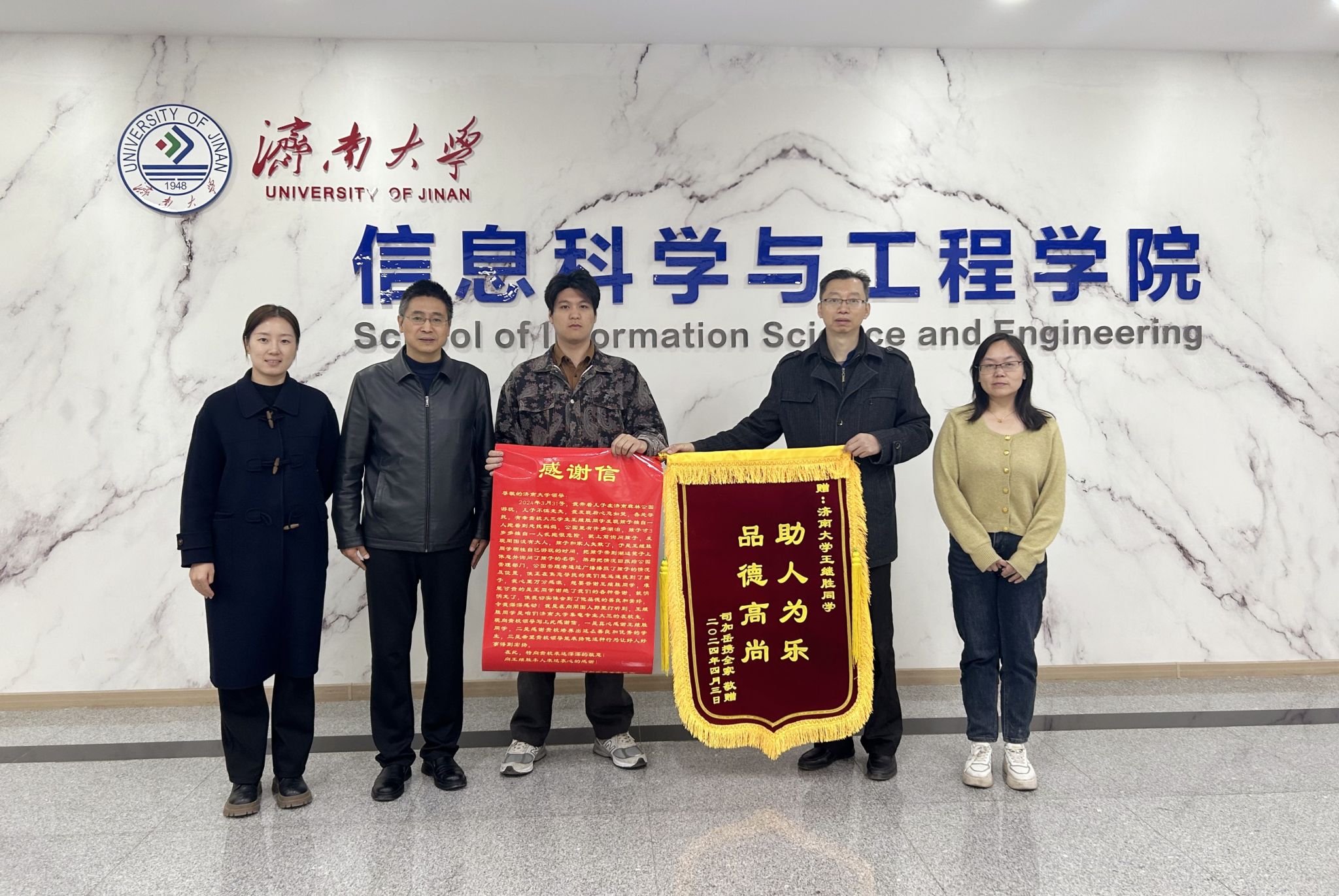 4月3日下午,信息科学与工程学院收到了一封感谢信和一面锦旗,信中详细描述了英国365官网2021级集成2101班学生王继胜同学帮助3岁走失儿童找到父母的事迹。
