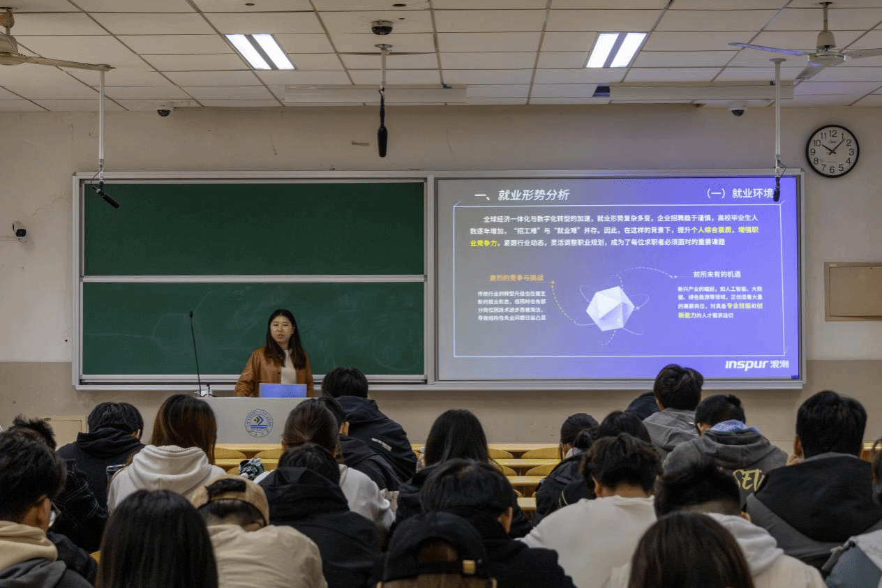 山东浪潮优派科技教育有限公司袁凯老师围绕就业形势分析、IT行业认知、“浪潮杯”大学生职业生涯规划大赛赛事解读等方面进行了详细介绍。她表示,职业规划大赛系列活动的举办,旨在帮助同学们更好地了解自我,明确职业生涯目标,同时解答就业困惑,为未来发展提供有益借鉴。她鼓励大家积极参赛,通过比赛,深入了解IT行业的最新动态和发展趋势,结合个人发展目标,明确自己在IT领域的职业定位和发展方向,为未来的职业生涯奠定坚实基础。
